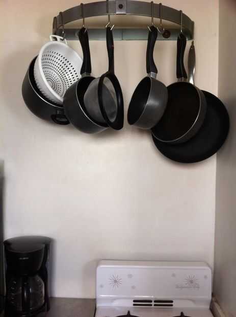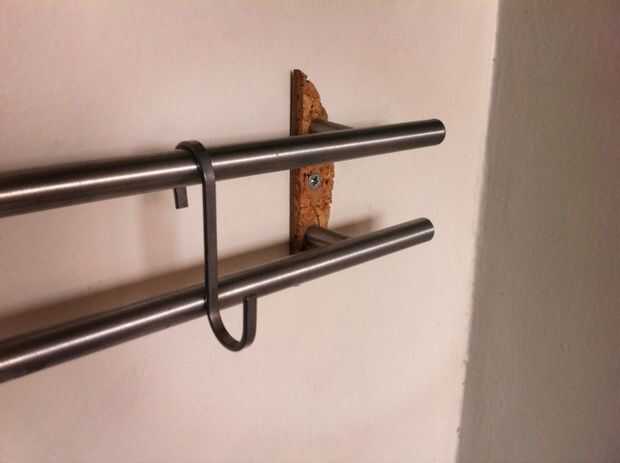En este momento tienes en tus manos un rack utensilio apuesto y modificado para requisitos particulares. Plan de colgarlo donde está accesible para cocinar. Lo ponemos encima de la estufa. Prueba de la rejilla en la zona donde vas a colgar. Utilice un nivel para verificar que es recta y marque la pared a través de los agujeros que ya realizados entre los soportes de la manija con un lápiz.