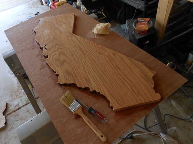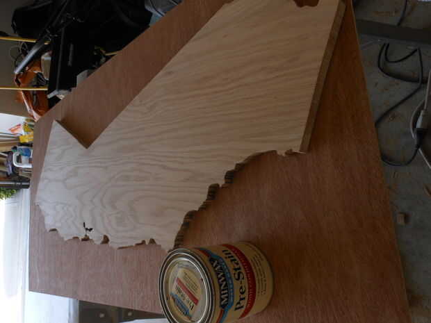 Empecé lijando. Deseo una increíble textura natural, después utiliza un acondicionador de madera antes mancha y lijar más. Porque sobre todo se guardar vinos tintos, elegí un mancha llamada cabernet. Me pareció adecuado para la aplicación y el rojo se vería bien en el espacio que había elegido para esta obra.