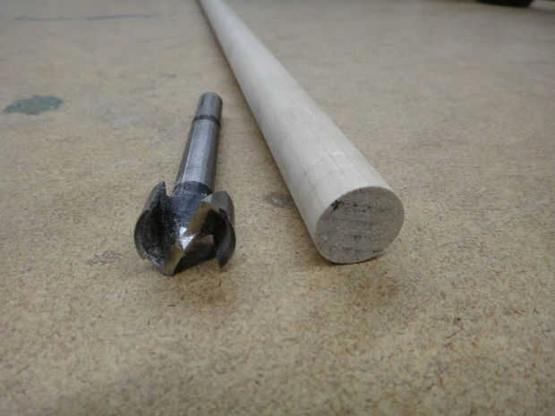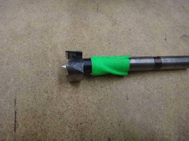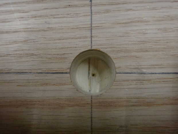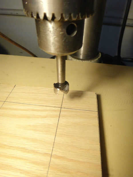 Ahora necesita perforar los orificios 10 usando la broca Forstner. Tenga en cuenta que se sólo perforar 5/8" 3/4 tablero grueso, dejando una gran superficie para el pegamento, razón por la cual es necesario utilizar una pieza Forstner. Estas brocas taladros hermosa en madera contrachapada y dejan un fondo plano, pero es necesario establecer la profundidad. Usé un taladro con un tope de profundidad, pero si usted está usando una medida de taladro de mano 5/8" hasta la broca Forstner y envolver un trozo de cinta alrededor del eje. Perfore los orificios mirando del lado y al llegar a la cinta sabes que llegar a la profundidad.