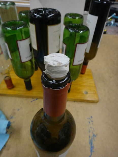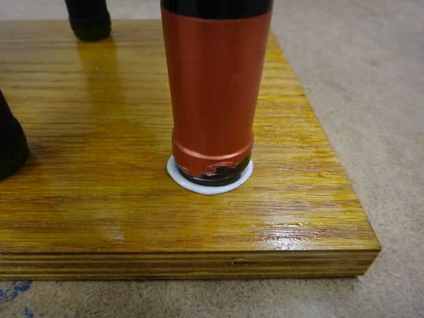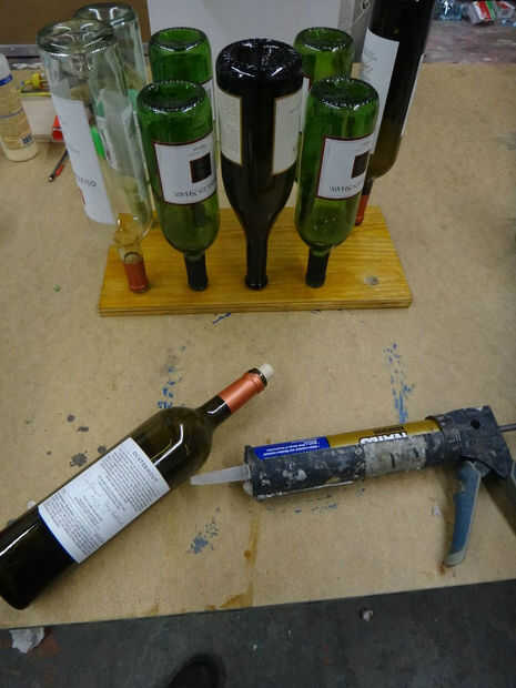Asegúrese de que la placa esté seco, retirar las toallas de papel y colocarlo en algún lugar estable. Una vez que ha pegado y colocan todas las botellas que la Junta realmente no debe moverse hasta que el adhesivo de construcción está completamente curado. Cubrir completamente los extremos de la clavija con el pegamento de construcción y asiento entonces cada botella en su agujero. Adhesivo de la parte superior, el sólo límpielo antes cura.
