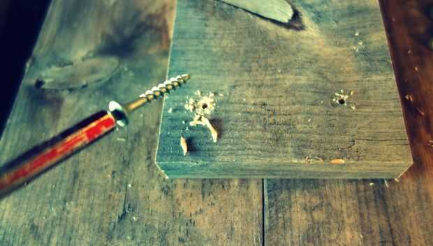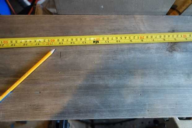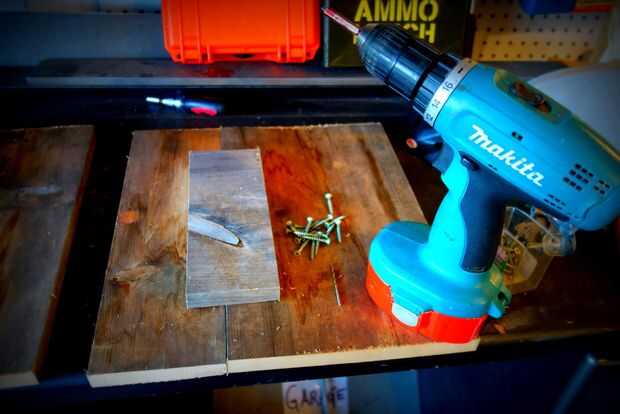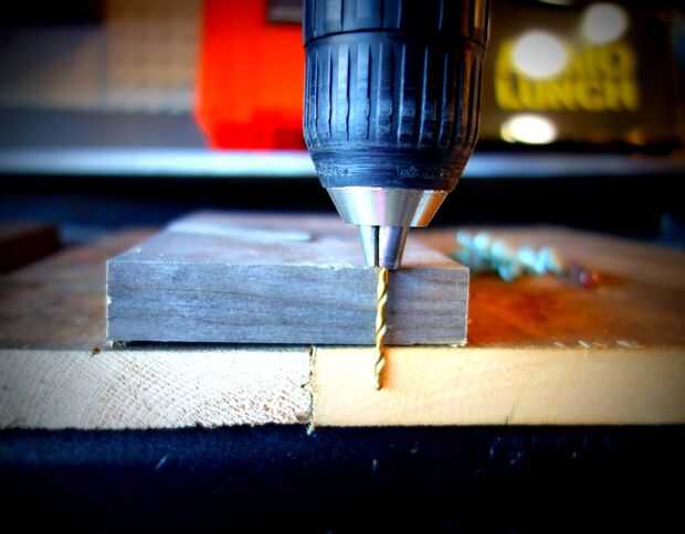 Medir el tablón y picarla. Mi tablón era un poco estrecha, así que añadido un ancho medio. Para casarse con las dos piezas, usé un pedazo de chatarra. Asegúrese de efectuar las tablas, vea el cuadro para ver cómo aseguró que no hacer un agujero por la parte superior de la plataforma. Si la broca es demasiado larga, puede envolver un elástico en el límite de la profundidad deseada.