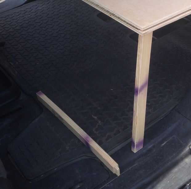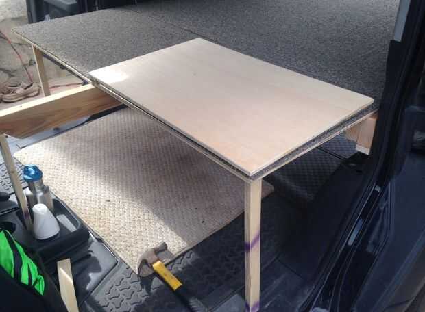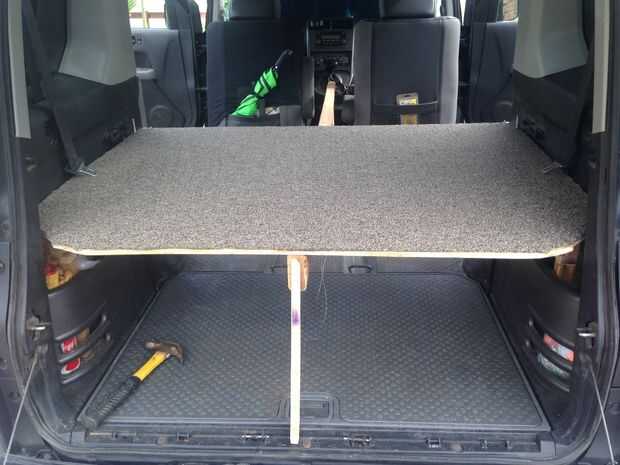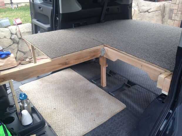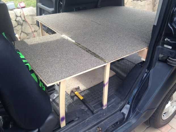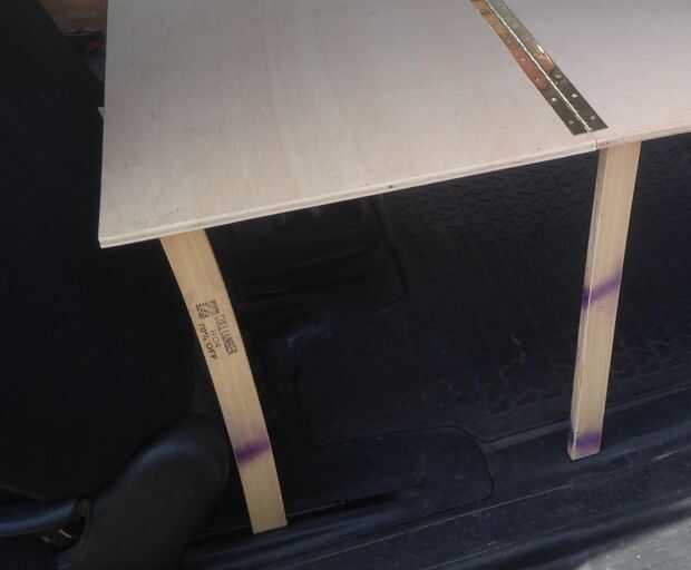 Añadir 3 capas (luz peso y da buen apoyo) la madera contrachapada cortadas a la medida. Perfore agujeros de taco en los lados y la espalda (ayuda a estabiliza el resto del brazo). Añadir alfombra. Añadir bisagra de piano. dos llaves de soporte frontal son en las bisagras de una y uno es de pié que encaja en el corredor del asiento del conductor.