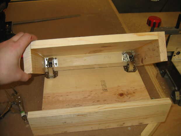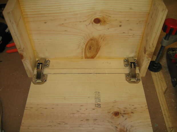 a continuación necesitamos fijar libremente las bisagras. os adjunto mina al fondo primero, medida 3/4" de la parte posterior para tener en cuenta la pieza posterior. una vez que las bisagras se unen a la parte inferior abra y coloque la tapa al lado como la segunda foto. Ahora usted puede alinear los orificios y sin apretar tornillo en el half.once superior, que ambos lados se atornillan libremente en usted puede abrir y cerrar y hacer ajustes antes de apretar para asegurarse de que tiene un ajuste ceñido.