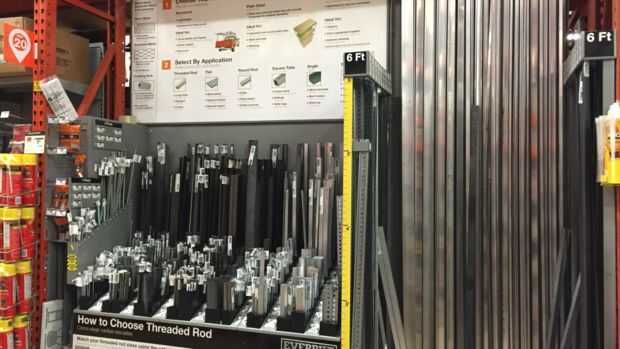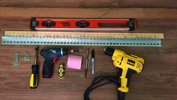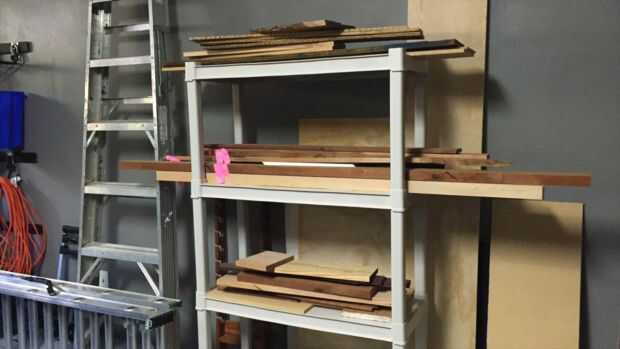 Encontramos algunas piezas agradables de la madera en la pila de desecho de Steph. Caminó alrededor de la tienda grande de la caja y encontró hierro de ángulo ranurado como una manera de mantener la madera en la pared.