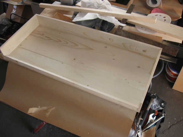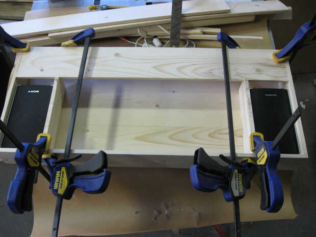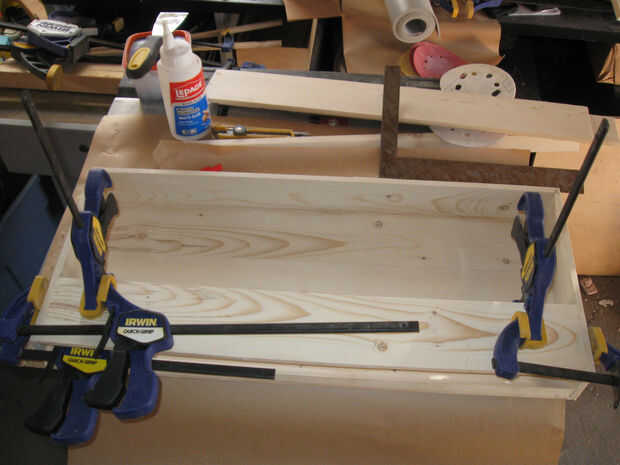 Pegamento y abrazadera 24 pulgadas pedazo de corte cortan de la franja de 2 3/4 de pulgada en el interior de la tira del estante inferior como se muestra.