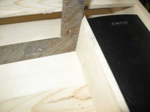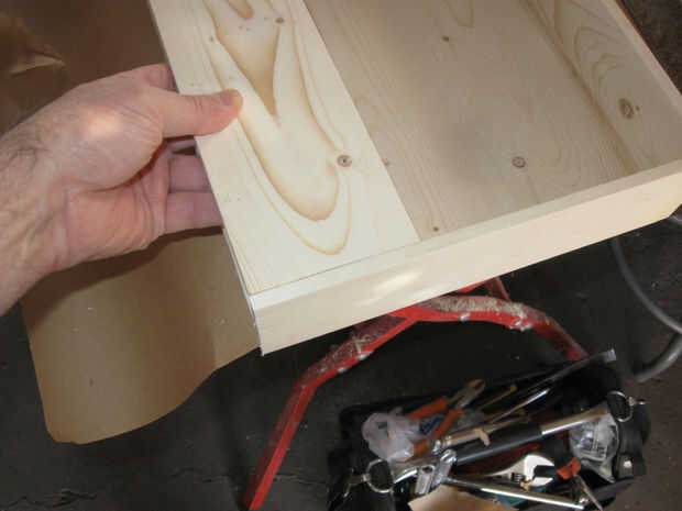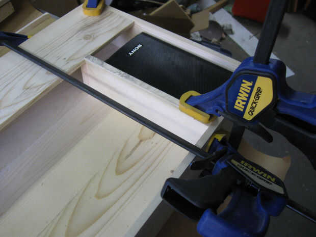 Las secciones de altavoz necesitan un reborde frontal para sujetar la parrilla pulg que esto es una tira de 3/4 de pulgada de una de las restantes secciones de 24 pulgadas. y pegado a la rejilla de soporte del altavoz como se muestra.