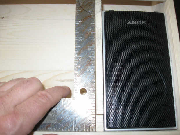 Medir el ancho de los altavoces y el pegamento en una sección de divisor a ambos lados del estante como se muestra. Corte las secciones necesarias para montar como se muestra.