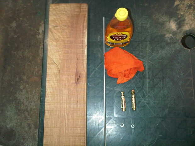 1) pieza de madera sólida para el estante 2) barra del hilo de rosca de 6 mm 3) tuercas de 6 mm x2 4) pernos de expansión de 6 mm x2 5) aceite de acabado madera apagado (opcional)
