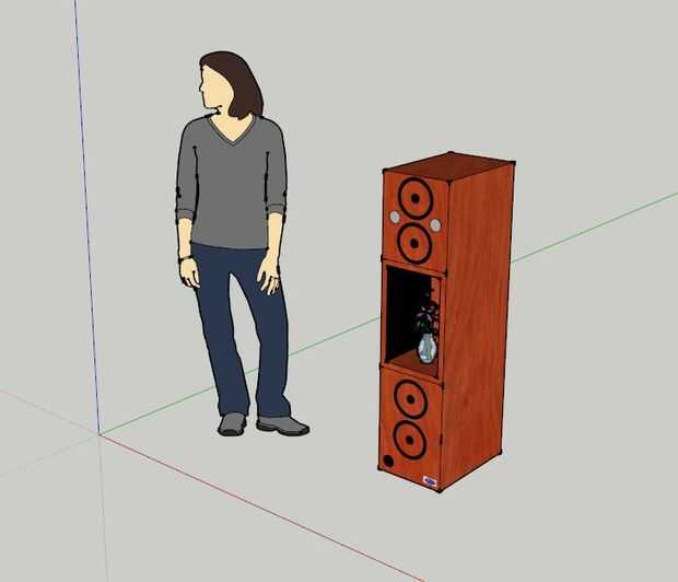 La primera representación fue plana. Después de un par de videos más cuando estaba aprendiendo a tirar, empujar, arrastrar y mi idea realmente empezaba a tomar forma! Pensé que sería poner los tweeters extras por el cerrador superior a nivel del oído por lo que no suena como una caja de auge en el piso.