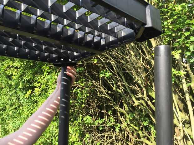 He experimentado y subió con la idea de atar con correa la estantería junto a buenas viejas ataduras de cremallera. Esto fue muy eficaz en la estabilización de los grupos de estantes pero luego necesitaba para fijar un marco para mantener algún tipo de revestimiento y sostener un techo.