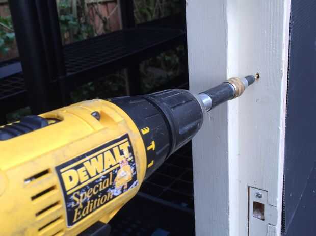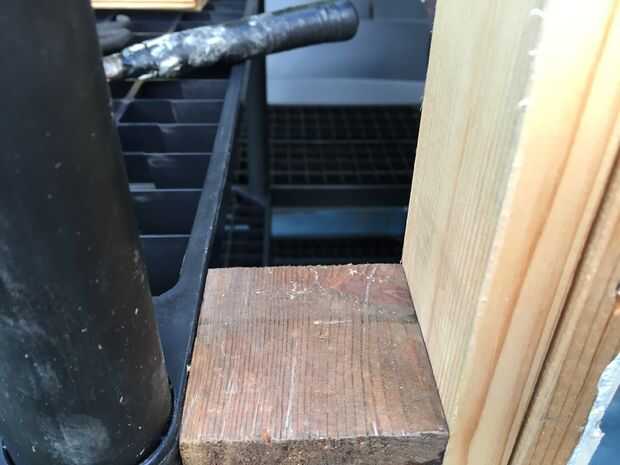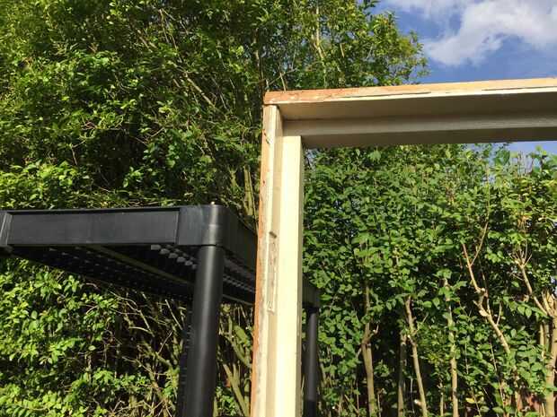 Tenía un viejo marco de la puerta y puerta, que era demasiado buena para el trabajo, pero era la solución más económica. La coloqué en el hueco. Entonces asegurado directo a la estantería de plástico. En un lado que necesitaba cortar bloques de relleno que reforzado con escuadras metálicas.