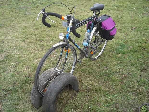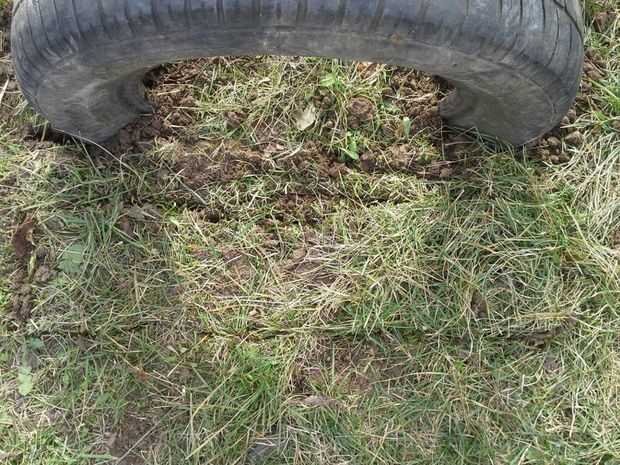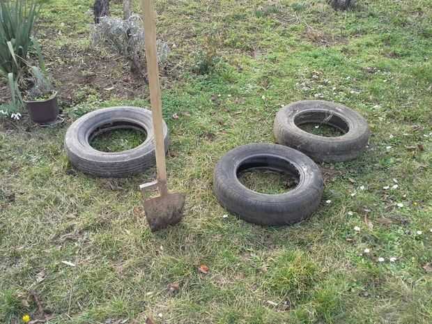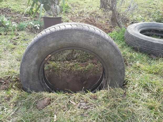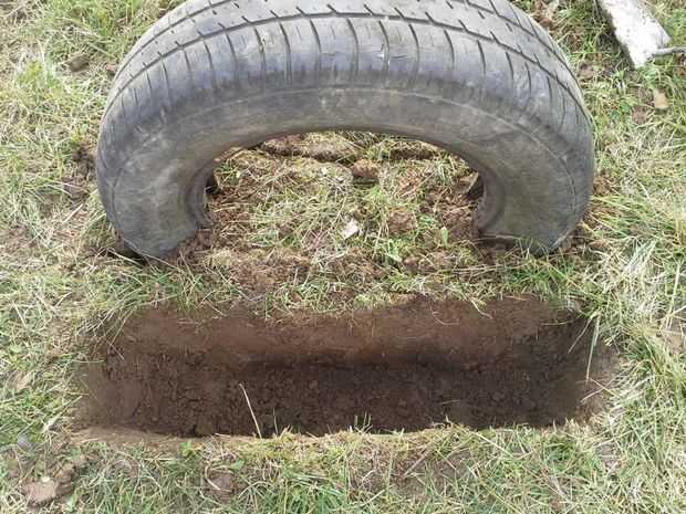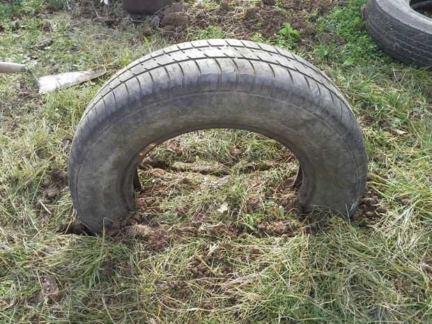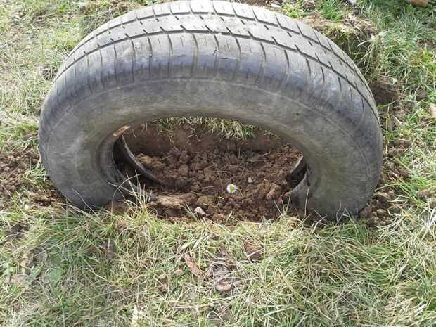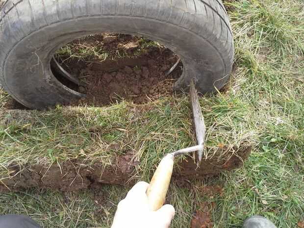 Poner neumático dentro, rellenar con tierra y poner en la capa superior de tierra con hierba.