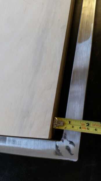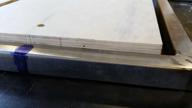 Coloque encima de la tubería al lado de los paneles laterales de capas sobre una superficie plana. Utilizando las líneas previamente trazadas en la parte delantera de la capa, línea de la tubería del metal con la parte delantera pero no olvides dejar un pequeño hueco en la parte superior (por razones estéticas).