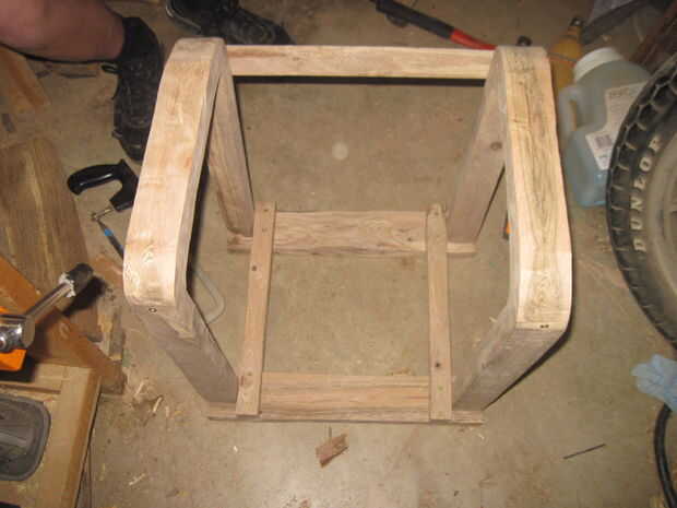 B-dos tablas largas de 11 pulgadas de 1 y 1/4 pulgadas por 2 pulgadas---esto es para la pieza curvada en la parte superior de los brazos