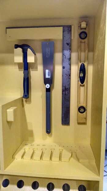 Ahora que la plataforma es pintada, es hora de añadir paréntesis personalizado para todas sus herramientas. La idea aquí es crear titulares que sólo aceptan la herramienta particular que pertenece en el estante especial. Decidir donde va cada herramienta y luego trace la herramienta particular. Bloques de 2 x yo solía crear un soporte para muchas de las herramientas y cortar los perfiles en la sierra. Esta parte no está incluida en los planes debido a la enorme diferencia de herramientas. Esperemos que las fotos le inspirará para crear algunos de sus propios métodos de contención.