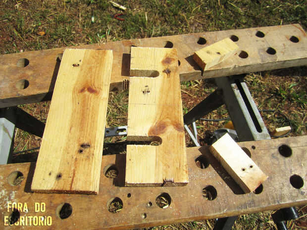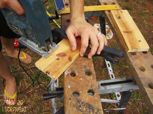 Después trazar 2 líneas de los bordes del agujero al borde de la madera y cortar con una sierra de calar.