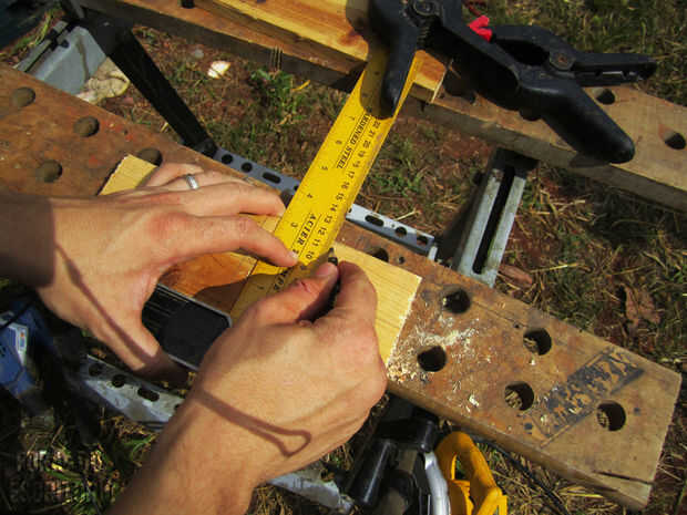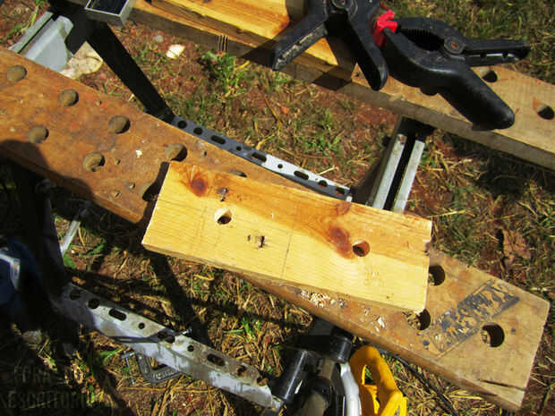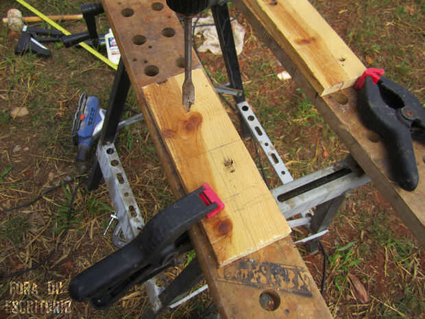 Haciendo eso a partir la madera en 2 piezas exactas. Medir el centro de cada pieza y perfore un agujero con la 1/2 plana broca.