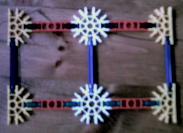 Empezar por acaparamiento 4 x conectores rectos, conectores 2 x 360 grados, conectores 4 x 180 grados, 3 x 54mm varillas y barras de 8 x 16mm. Conectar éstos en la forma de la imagen de abajo.