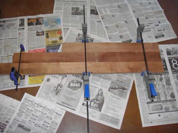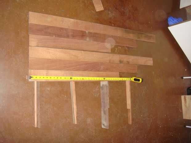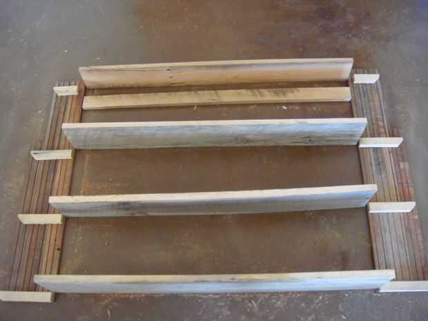 Los lados fueron hechos de pisos de madera recuperado y mediante la utilización de la lengüeta y ranura existente hace muy fácil montaje. Tres tableros de dan suficiente anchura, y encontré suficiente tablones largos para mantener la uno pieza externo de rieles. Después de pegar cortado la lengüeta y ranura sin usar para los bordes limpios.