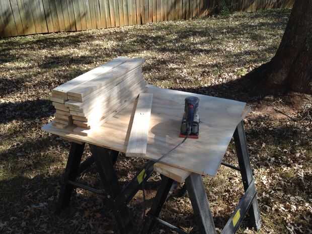 Después de todos los cortes se realizaron utilicé una lijadora de la almohadilla con lija de grano 80 para desprender los bordes y suavizar las juntas. Decidí dejar mis estanterías natural, y quería dejar la marca de los fabricantes, así no la arena demasiado agresivamente.