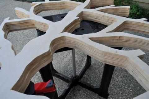 Una vez finalizado el lasering, montar las piezas usando pegamento de madera entre cada capa y los amarre juntos hasta que se seque. Usted querrá asegurarse de que utiliza todas las piezas de la versión 1 para una capa, luego pegue todas las secciones de la versión 2 como la capa siguiente. Esto garantiza que el árbol es más estable en los saltos de sección.