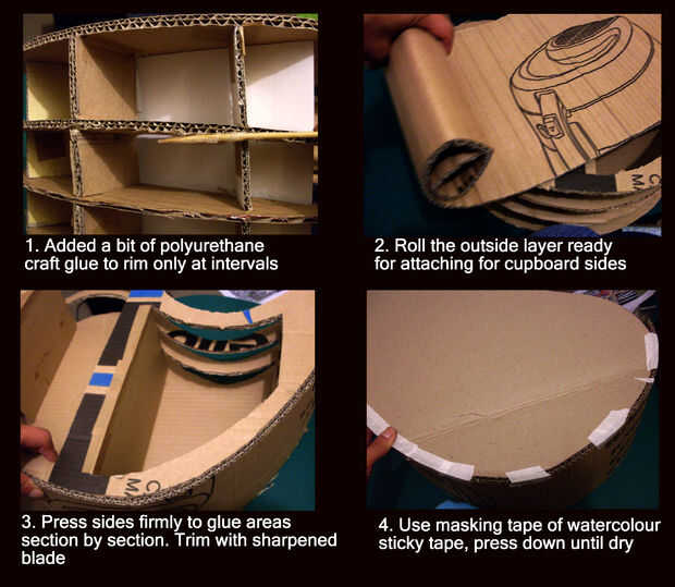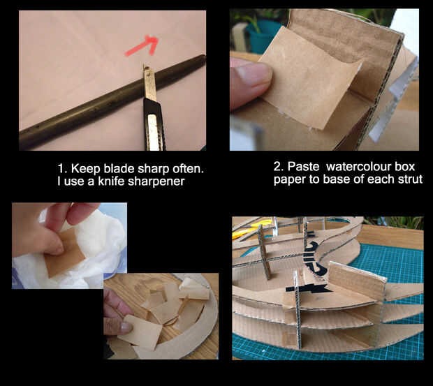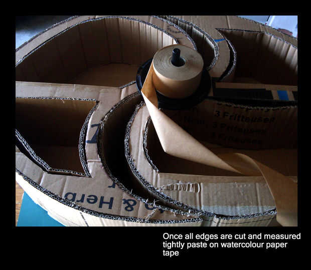 Ahora moje la cinta de papel de acuarela en el lado pegajoso, recortar las aberturas para las curvas, junte firmemente los bordes y pegar en la cinta para fortalecer sus interiores struts.