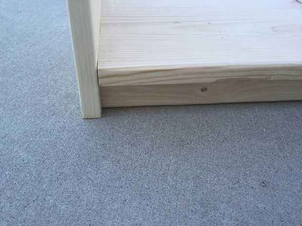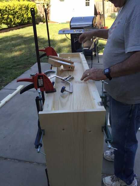 A continuación nos aseguró que la parte inferior se sujeta firmemente a los montantes y volteado todo en la parte superior. Cada llave fue quitado y bolsillo escondido en cada extremo. Luego pega y sujeta en la parte inferior del estante inferior. El refuerzo a lo largo de la parte delantera tiene una revelación que fue marcado por el pie de la abrazadera de la esquina.