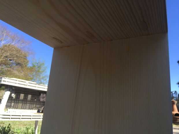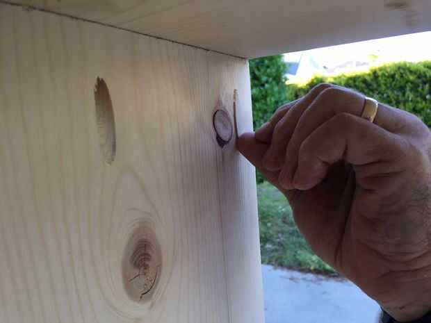 Llegando al final, tuvimos que tapar el bolsillo los agujeros en los postes y por debajo de los estantes. Realmente no ver la parte inferior de los estantes, pero después de hacerlo y tener gente capaz de identificar el método de ocultación, estoy muy contento con la decisión. El enchufe venido un poco más que lo necesario para el material de 3/4, por lo que fueron recortados a la longitud aproximada, pegados y lija al ras.