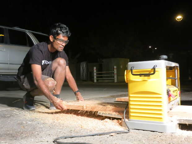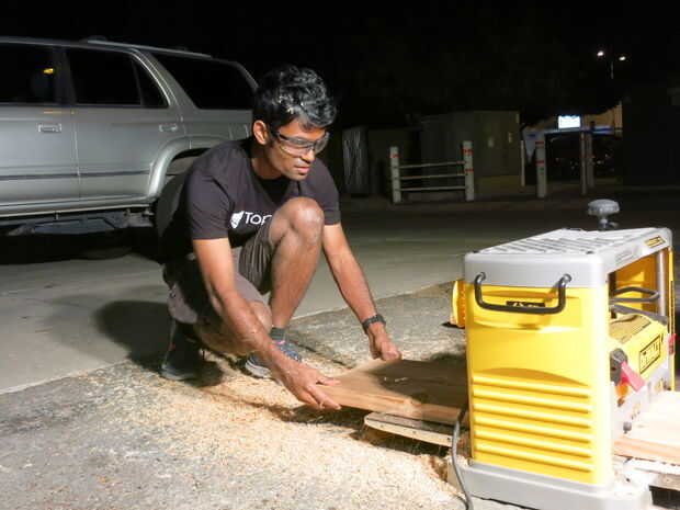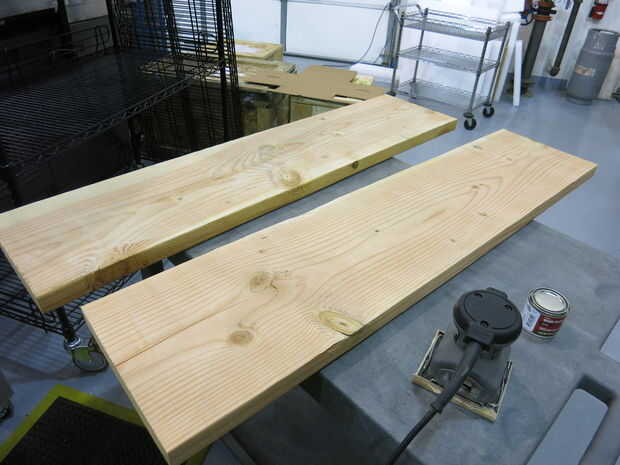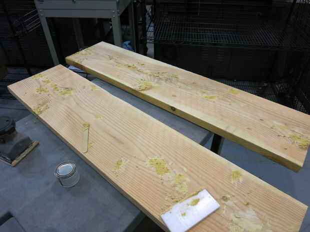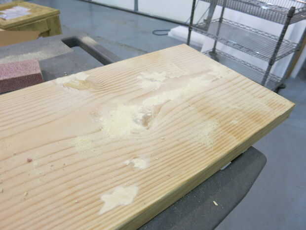 Encontré un fabricante local en Mesa, y tenían un cepillo. Tomé mis tablones a ellos y les cepillada. Sin embargo, todavía había algunas abolladuras en las tablas. Luego fui a Ace Hardware y compró algunos relleno de madera. Utilizar una espátula para poner en el relleno de madera y luego lijar con grano grueso, entonces medio.