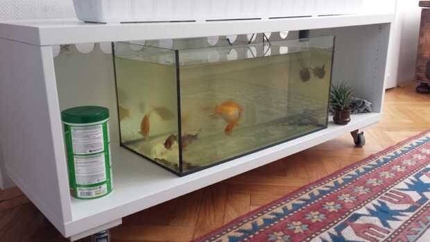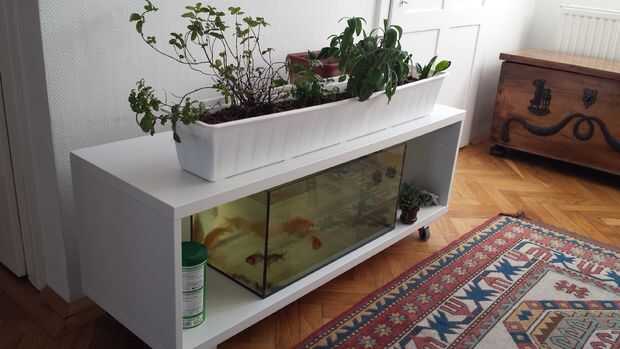 En lugar de ponerlos en un acuario común con un filtro estándar, decidí construir una instalación de acuaponia interior en su lugar. Como este sistema se encuentra en mi apartamento, apariencia y diseño son igualmente importantes como la funcionalidad. Therfrore, me decidí a construir el sistema basado en un estante de ikea que coincide con mis otros muebles.