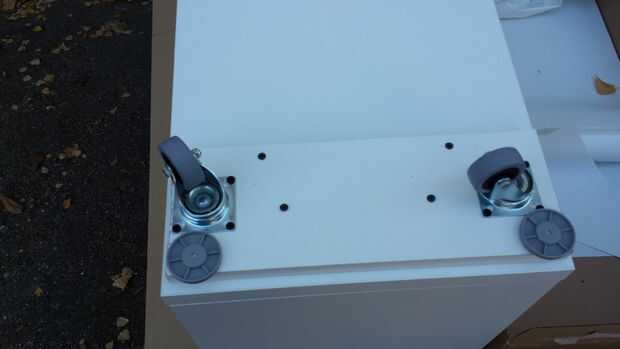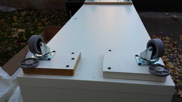 Entonces voltee el gabinete entero y montar las ruedas. Queremos evitar a montar directamente las ruedas en el panel inferior debido a la limitada cantidad de estructura de soporte que el conglomerado ofrece a los tornillos. Por ello os pongo un trozo grueso de madera en el medio que atornillado en la ya availabale hilos de Ikea que montar las patas en el estante.