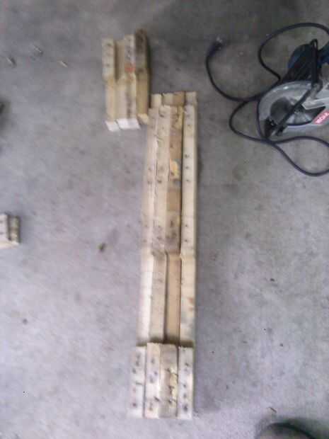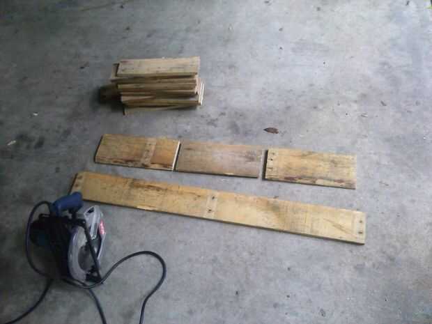 Usé una sierra habilidad para hacer los cortes. Usé los soportes de la plataforma para hacer los soportes de la estantería. Cortes de las sobras de las vigas de apoyo que utiliza como soporte para el estante sí mismo. Para el lado de la estantería hice 14 cortes de madera de 7 para cada lado. Hice el lado 12 pulgadas de ancho. la espalda de 30 pulgadas de largo y me habían hecho 4 con uno que va hasta el centro. los estantes de sí mismo es de 26 pulgadas de largo. era más madera que previsto pero vale la pena.