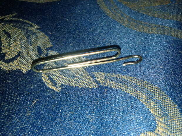 1. con unas tenazas o alicates de punta, pinza el extremo recto del clip de papel jumbo, dejando aproximadamente 1/4"