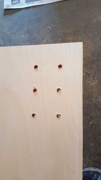 Consejo: utiliza una broca más pequeña para un agujero piloto, a través, después perforado a medio camino a través de un lado con el 1/4" bits, volcó la hoja y perforar la otra mitad a través de. Hice esto para ayudar a evitar que la madera rasgado cuando golpea a la broca por el otro lado. Tomar mucho más tiempo, pero parece mucho más bonito cuando los agujeros están limpios.