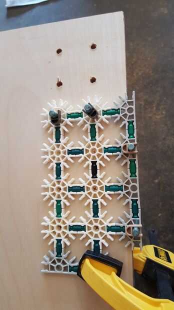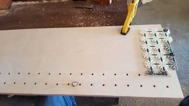 Empecé a perforar en la pieza media (1'x 4'). Una vez que el primer conjunto de agujeros se perforan mueva que la plantilla en los últimos hoyos se perforó y alinee el borde de la plantilla con el borde de la hoja de madera contrachapada. Repita este proceso hasta llegar al final de la hoja de madera contrachapada. Luego reconfigurar mi plantilla ligeramente y marcó el resto de los orificios de perforación.