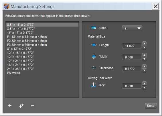 1) por la pestaña que dice configuración de la fabricación, haga clic en el lápiz y se mostrará esta pantalla. Para agregar un nuevo Material haga clic en el signo de más abajo. He etiquetado como mina madera de la capa porque tengo pensado en hacer varios proyectos con esta gran cantidad de material. para las unidades mantuve en pulgadas y luego entró en el siguiente