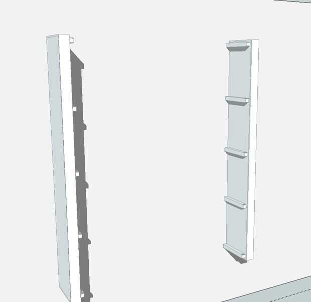 2. 2 lados: izquierda y derecha son simétricas (idénticas pero espejada). Los lados se 'enganchan' a los ganchos antes mencionados