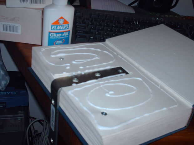 El pegamento sostenga la cubierta inferior del libro en su lugar, y los tornillos sujetan las páginas. Poner la pila de libros encima el trato todo y esperar un día para otro.