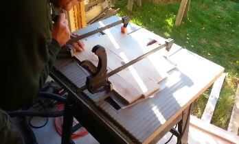 Luego aplique cola a todos los bordes de unión de cuatro de sus tablas. Luego fije con abrazaderas los tableros juntos firmemente. Colocar papel encerado debajo de las tablas en caso de que cualquier pegamento se filtra hacia fuera. Su proyecto no se adhieren al papel de cera.