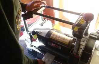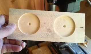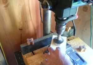Ahora pasar a la prensa del taladro y uso que un forstner broca del tamaño de la parte inferior de la botella que se utilizará en pantalla. Estos serán en la parte superior del estante superior. Establecer la profundidad en el taladro para hacer una profunda depresión suficiente para sostener las botellas. Asegúrese de que los agujeros estén centrados según las botellas que use. Rastrear las botellas en el estante con un lápiz si es necesario. También puede utilizar un taladro eléctrico de mano para esto, pero usted necesitará brocas forstner. Brocas Forstner pueden adquirirse en conjuntos y no son demasiado caros.