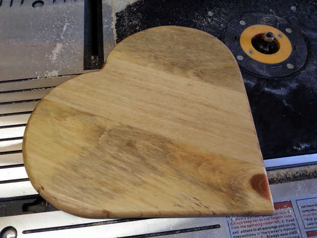 Finalmente, el pegamento se haya secado y estamos listos para cortar el corazón. Dibujó un corazón en mis tablas de palet que el corazón era aproximadamente 10 1/2 pulgadas de alto y 10 pulgadas de ancho. Ángulo de patrón para hacer los listones inclinados. Luego corte el corazón utilizando una sierra de calar o una sierra de contornear. Usted necesitará utilizar ya sea un router de arena que alrededor de los bordes. Yo uso mi mesa de fresadora y cantos todos incluyendo el estante.