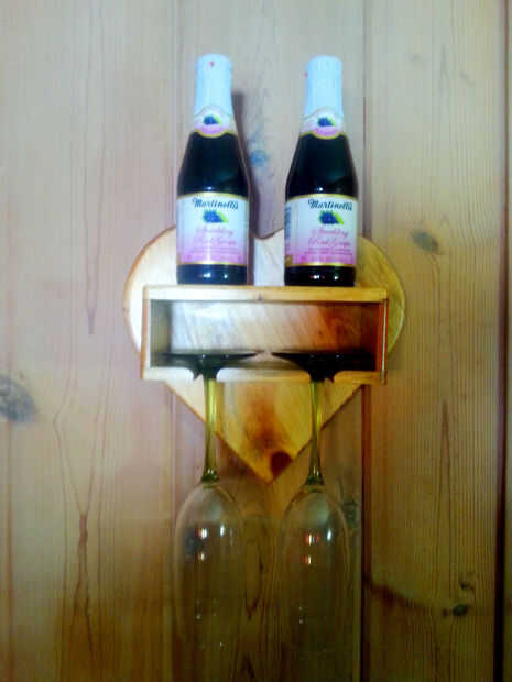 Elegir una forma de colgar la estantería. Utilizado un ojo de la cerradura en un pedazo separado de tejido pegado a la espalda. Luego coloque sus mini botellas en el estante. Estas botellas se pueden pegar en su lugar si lo desea. Recogí unas gafas bien tallos con un tinte verde. Todo lo que queda es encontrar un lugar en la pared para la nueva plataforma.