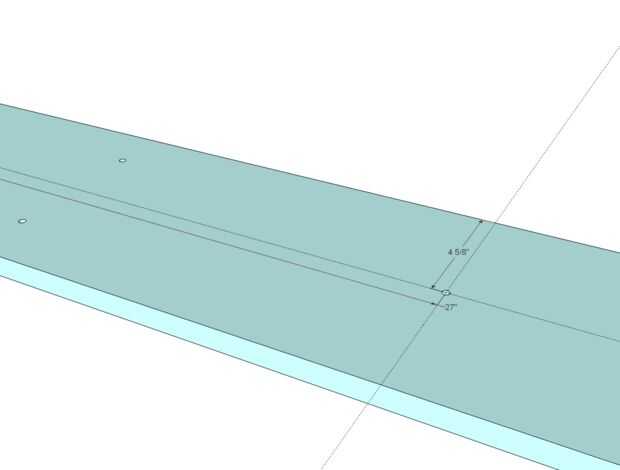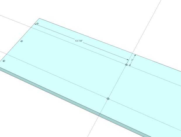 A continuación, taladré 2 agujeros 13 7/8" del extremo y 2" de a cada lado. Estos son donde la base y media piezas se acoplarán.