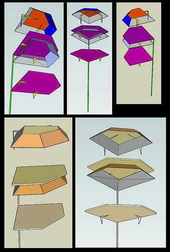Revisa la primera imagen, las representaciones de la estantería acabada, para tener una idea de como se ve en 3D. En esa imagen, los tiros principales están coloreados por parte:
