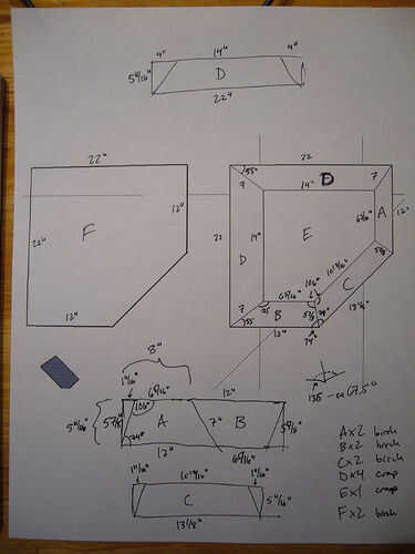 La otra foto es un bosquejo de los trozos de madera y varios cortes necesitados. Las piezas son etiquetadas por carta.