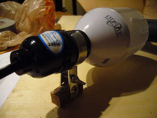 Sujete un trozo pequeño de madera contrachapada o MDF o algo a la esquina trasera de cada pabellón con unos tornillos. Debe ser de 1/4 "x 1/4" x 2". Lo importante es que la pinza de la luz pueda abrir suficientemente ancha como para caber alrededor de él.