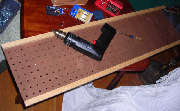 Fije los soportes a los bordes de la parte posterior del pegboard. Utilice tornillos de estrechos inferior 1/2" o pegaremos por la parte trasera. Porque la banda es estrecho y frágil, taladre orificios guía. Si no, el tornillo dividirá el atar con correa y tendrás que empezar de nuevo. Si usted no está teniendo suerte, podría pegar y sujetarlos al principio y luego añadir unos tornillos cuando se seca.