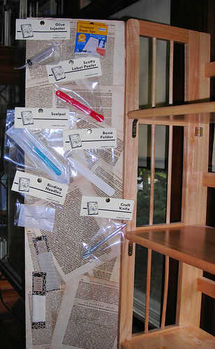 Real pegboard ganchos trabajo bien, pero he encontrado trabajo de sujetadores de latón muy bien para los artículos que se encuentran planos.