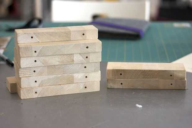 Utilizando el taladro perforé a pares de los agujeros en todas las piezas. Sujeta un par de trozos de madera para taladro para asegurarse de que todos los agujeros alineados correctamente.