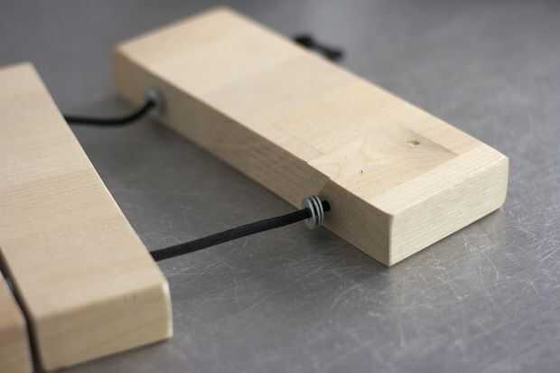 El cable a través de todas las piezas de madera, utilizando las arandelas de acero como separadores de cadena. Usé tres para cada espacio.